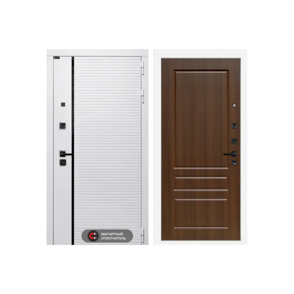 Фурнитура в черном цвете: Броненакладка врезная, накладка со шторкой, глазок , дверная ручка, ночная задвижка. Цилиндр ключ-вертушка Guardian, регулируемый эксцентрик.